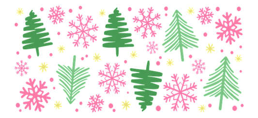 A festive pattern featuring green Christmas trees, pink snowflakes, and cheerful yellow dots, perfect for holiday decorations!UV Transfers dtf transfers
