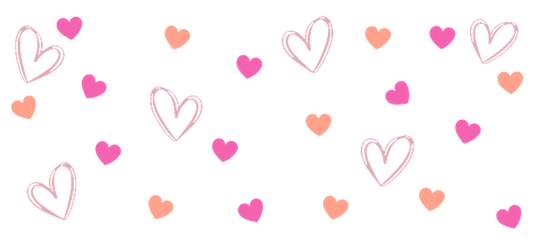 A vibrant pattern of pink hearts and shapes scattered against a black background.UV Transfers