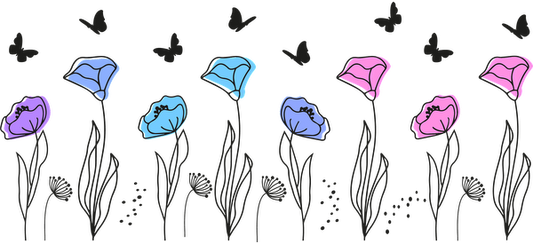A charming illustration of colorful flowers in shades of blue and pink, adorned with delicate butterflies.UV Transfers dtf transfersdtf regular iron
