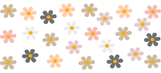 A vibrant pattern of colorful flowers featuring soft hues of pink, white, gray, and yellow, creating a cheerful design.UV Transfers heat press transfers