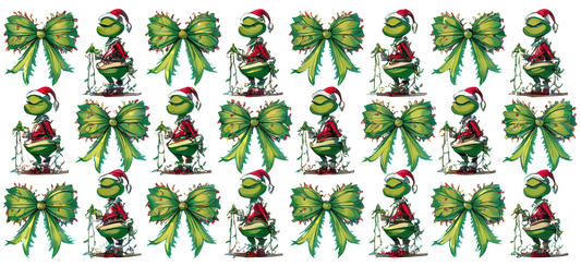 A festive collection of cartoon frogs wearing Santa hats, surrounded by vibrant green bows and holiday decorations.UV Transfers dtf prints