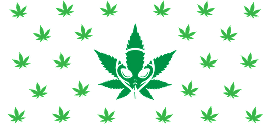 A vibrant pattern featuring various green cannabis leaves with a central alien design, perfect for a playful or psychedelic theme.UV Transfers dtf transfers