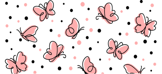 A whimsical design featuring delicate pink butterflies amidst playful dotted accents on a black background, perfect for a cheerful aesthetic.UV Transfers heat press transfers
