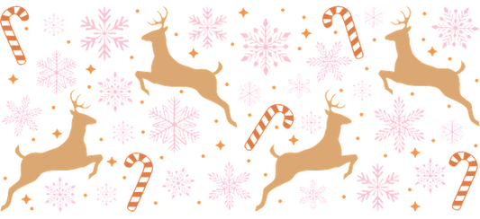 A festive pattern featuring playful reindeers, candy canes, and delicate snowflakes in soft pink and gold against a black background.UV Transfers dtf prints