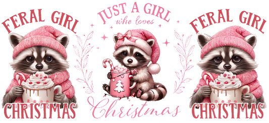 Adorable raccoons in festive pink hats celebrate Christmas with whimsical messages, perfect for holiday cheer and fun!UV Transfersdtf regular iron