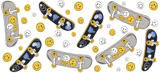 A playful design featuring various skateboards adorned with cheerful smiley faces and colorful graphics, perfect for streetwear or accessories.UV Transfers dtf prints