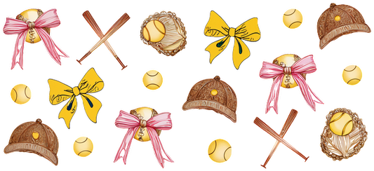 A cheerful pattern featuring baseball equipment, including gloves, bats, balls, and decorative ribbons in pink and yellow.UV Transfers dtf prints