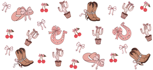A playful pattern featuring pink bows, cowboy boots, cacti, and cherries, perfect for a fun, Western-themed design!UV Transfers dtf prints