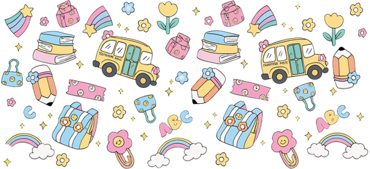 A vibrant and playful school-themed pattern featuring buses, books, pencils, flowers, and rainbows in cheerful pastel colors.UV Transfersdtf regular iron
