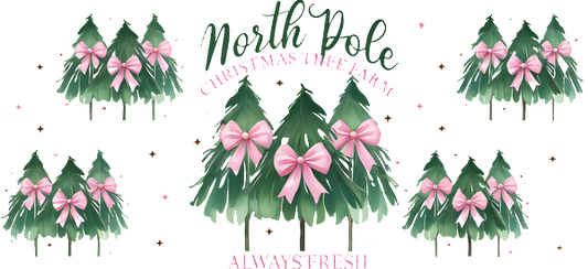 Festive design featuring lush green Christmas trees adorned with pink bows, highlighting the cheerful theme of "North Pole Christmas Tree Farm."UV Transfers dtf prints