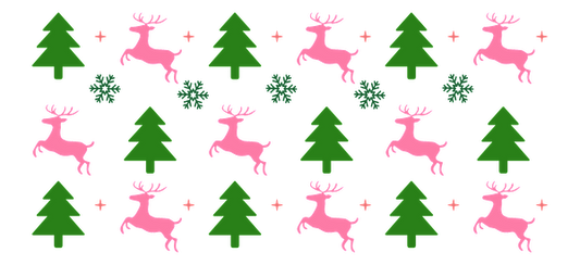 A whimsical pattern featuring playful pink reindeer, vibrant green trees, and festive decorations, perfect for holiday cheer!UV Transfers heat press transfers