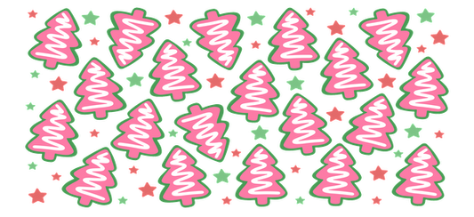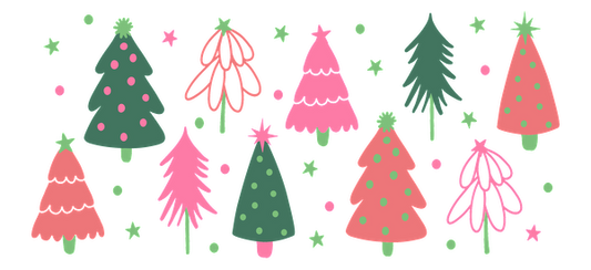 A cheerful pattern featuring pink Christmas trees and colorful stars, perfect for adding a festive touch to any design!UV Transfers heat press transfers