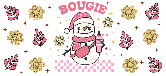 A charming, cartoon-style snowman wearing a pink scarf and hat, holding a drink, surrounded by flowers and the word "BOUGIE."UV Transfers dtf transfers