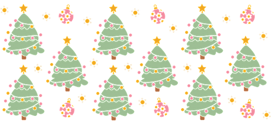 A festive and cheerful pattern featuring decorated Christmas trees, colorful ornaments, and flowers, perfect for holiday-themed designs!UV Transfers dtf transfers