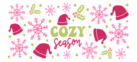 Celebrate the warmth of winter with this cheerful "Cozy Season" design featuring festive hats, snowflakes, and holly.UV Transfers dtf prints