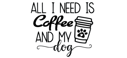 A charming design featuring the phrase "All I need is coffee and my dog," accompanied by a playful coffee cup illustration.UV Transfersdtf regular iron
