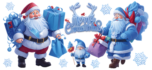 A cheerful group of cartoon Santa Clauses holds colorful gifts, showcasing a festive "Merry Christmas" sign among snowflakes.UV Transfers heat press transfers