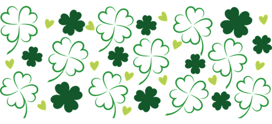 A vibrant pattern featuring green clovers and small yellow hearts, perfect for celebrating St. Patrick's Day or springtime.UV Transfers heat press transfers