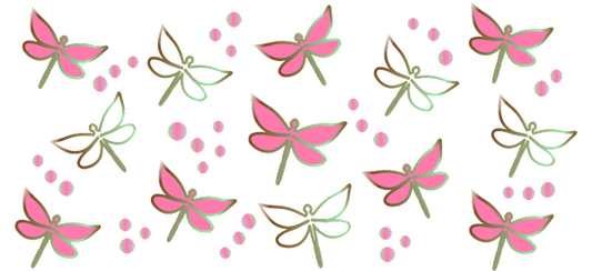 A vibrant pattern featuring colorful pink dragonflies and pink dots, perfect for a playful and cheerful design.UV Transfers heat press transfers
