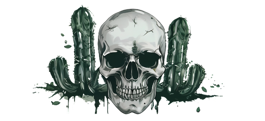 A striking graphic featuring a cracked skull surrounded by two green cacti, blending elements of nature and the macabre.UV Transfers dtf transfers