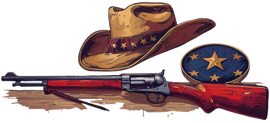 A vintage cowboy hat and a blue star-patterned badge accompany a classic red and silver rifle, evoking a Wild West theme.UV Transfersdtf regular iron