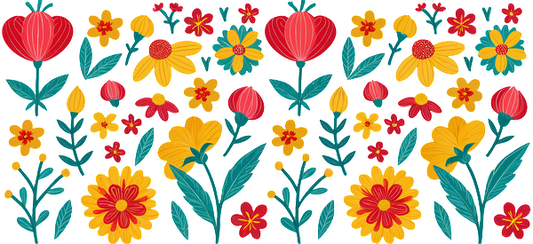 A vibrant floral pattern featuring a variety of red, yellow, and blue flowers with lush green leaves, perfect for design projects.UV Transfers dtf prints