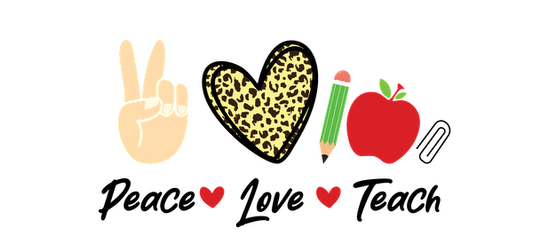 A fun illustration featuring a peace sign, a leopard print heart, a green and pink pencil, and a red apple.UV Transfers dtf transfers