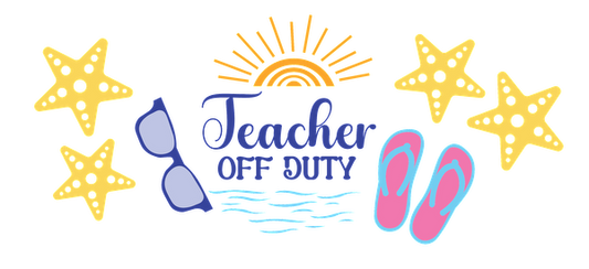 Playful summer-themed design featuring "Teacher Off Duty" text, sunglasses, flip-flops, and starfish, perfect for teachers enjoying vacation.UV Transfersdtf regular iron