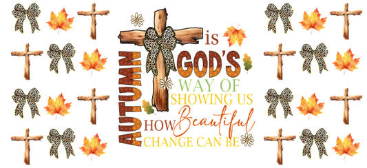 This autumn-themed design features wooden crosses, colorful leaves, and a heartfelt message about God's beauty in change.UV Transfers