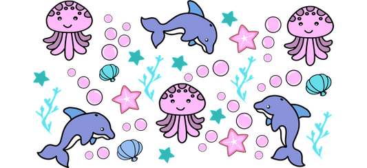 A whimsical underwater scene featuring cheerful dolphins, jellyfish, stars, and seaweed in vibrant pink and blue colors.UV Transfers dtf prints