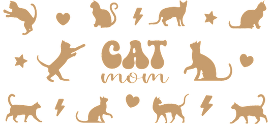 A whimsical design featuring the phrase "CAT mom" surrounded by playful cat silhouettes and cute icons in a warm color palette.UV Transfers dtf transfers