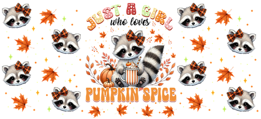 A whimsical autumn-themed graphic featuring cute raccoons with bows, pumpkins, and the phrase "Just a Girl Pumpkin Spice."UV Transfers heat press transfers