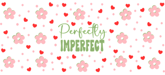 A vibrant pattern featuring playful flowers and hearts with the phrase "Perfectly Imperfect" in a whimsical font.UV Transfers dtf transfers