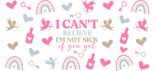 A colorful and playful pattern featuring hearts, rainbows, doves, and the phrase "I CAN'T BELIEVE I'M NOT SICK OF YOU YET."UV Transfers dtf transfers