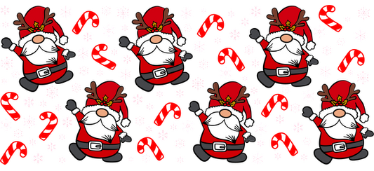 A festive pattern featuring cheerful Santas in red suits surrounded by candy canes and snowflakes, perfect for holiday decor.UV Transfers dtf prints