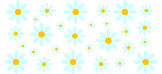A vibrant arrangement of light blue daisies with cheerful yellow centers, creating a lively floral pattern perfect for any design.UV Transfers dtf prints