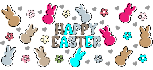 A colorful Easter greeting with cheerful bunnies and flowers, featuring the phrase "Happy Easter" in playful lettering.UV Transfers dtf transfers