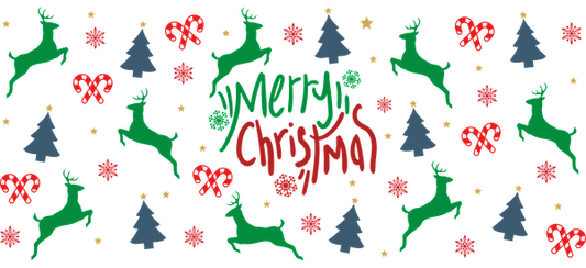 A festive Christmas pattern featuring reindeer, Christmas trees, and ornaments with the cheerful message "Merry Christmas."UV Transfers dtf prints
