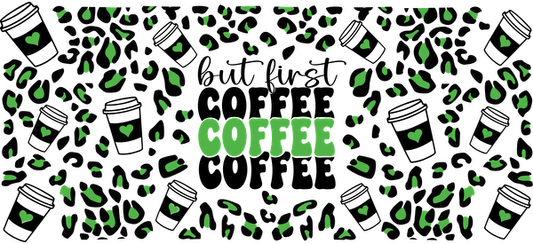 A vibrant and playful graphic featuring the word "COFFEE" in bold green, surrounded by coffee-themed icons and leaves.UV Transfers dtf prints