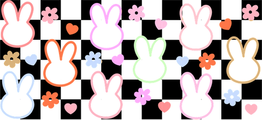 A colorful pattern featuring outlined bunny shapes, flowers, and hearts, perfect for spring-themed designs or decorations.UV Transfers dtf prints