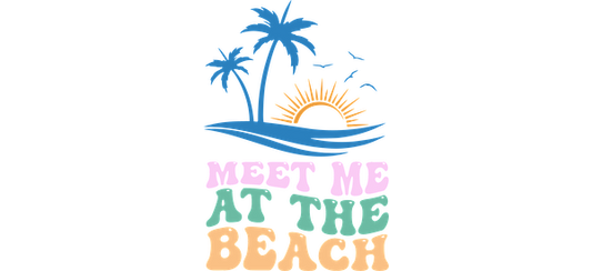 Colorful graphic featuring palm trees, sun, and the playful phrase "Meet Me at the Beach." Perfect for beach lovers!UV Transfers dtf transfers