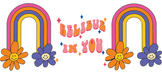 A vibrant, cheerful design featuring colorful rainbows and happy flowers alongside the motivational phrase "Believe in You."UV Transfers dtf prints