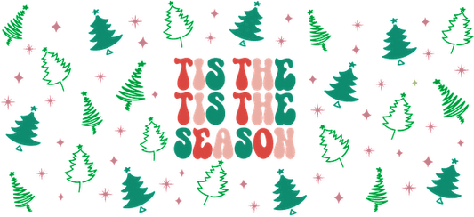 A festive design featuring the phrase "Tis the Season" surrounded by colorful Christmas trees and sparkling snowflakes.UV Transfersdtf regular iron