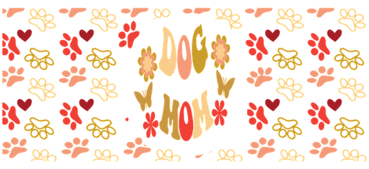 A playful and vibrant design featuring the words "Dog Mom" surrounded by colorful paw prints and hearts, perfect for dog lovers.UV Transfers dtf prints