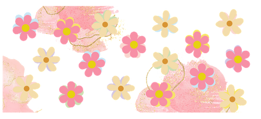 A vibrant, whimsical floral design featuring pink and yellow flowers against a soft pink background, perfect for spring themes.UV Transfers dtf prints