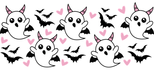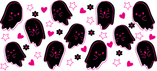A playful design featuring cute black ghosts with pink horns and hearts, perfect for adding a whimsical touch!UV Transfers dtf transfers