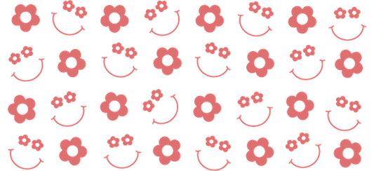 A playful pattern featuring smiling faces and cute flowers in soft pink tones, perfect for a cheerful design.UV Transfers heat press transfers