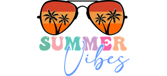 Bright and playful graphic featuring the words "Summer Vibes" with colorful letters and palm trees inside sunglasses.UV Transfers heat press transfers