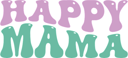 Colorful, playful lettering spells "Happy Mama," featuring organic shapes in purple and green for a cheerful vibe.UV Transfers heat press transfers