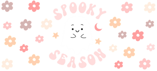 A cute design featuring a cheerful ghost surrounded by pastel flowers and the phrase "Spooky Season." Perfect for Halloween vibes!UV Transfers dtf prints
